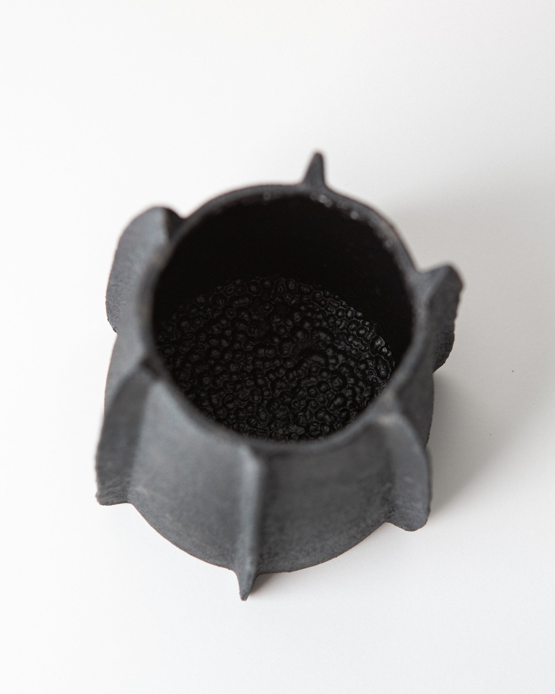 Wheel-thrown stoneware vase with a rough black glazed finish on the exterior and a cratered matte black glaze on the interior. This piece was wheel thrown and then the ridges on the exterior were added by hand to give it a gothic, brutalist styling.