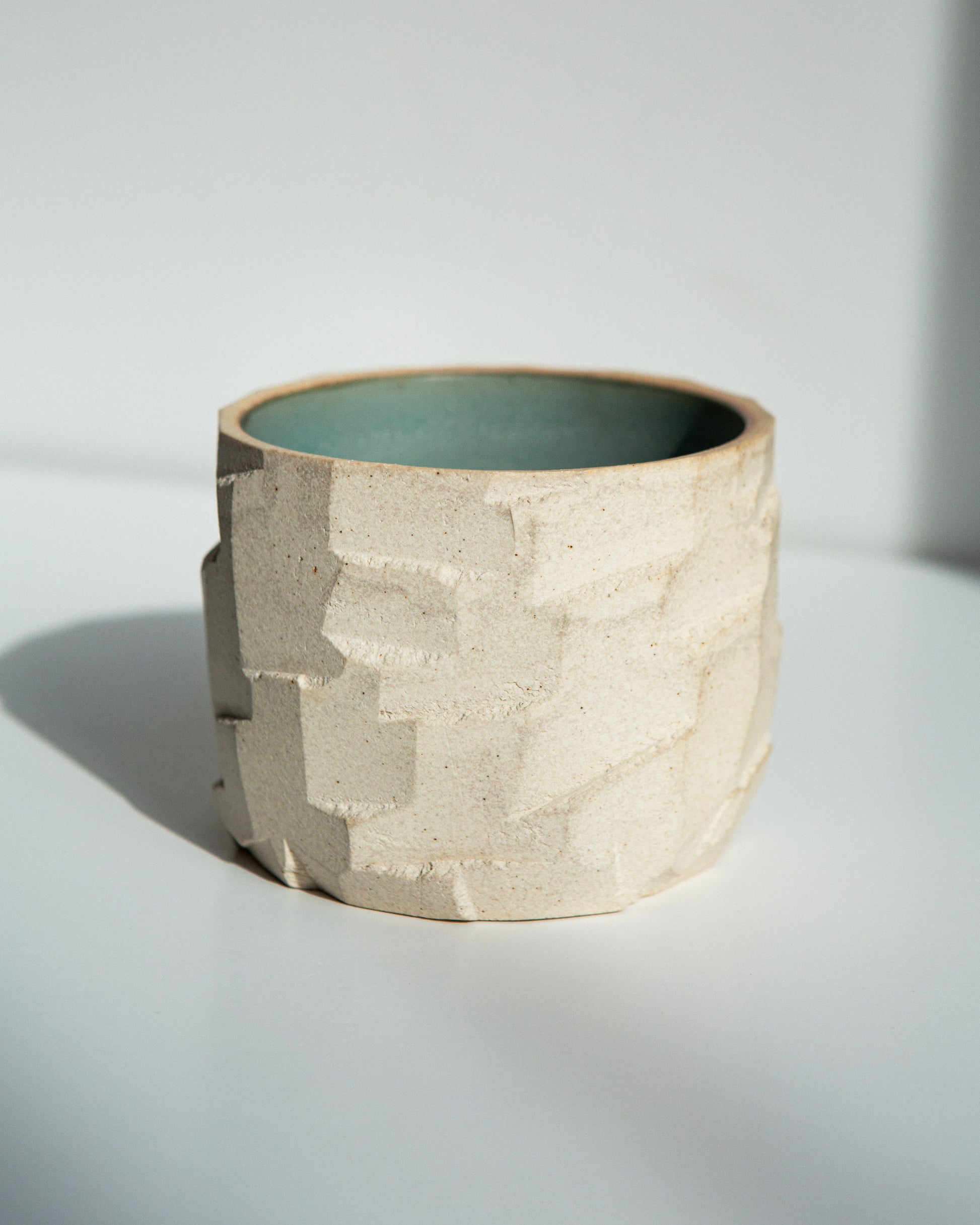 This cup was made with a white stoneware clay, the inside features a matte teal glaze while the exterior is left raw. The exterior finish is white with minor grey coloring. This cup is inspired by the kurinuki pottery technique from Japan. I form this cup on the wheel and then carefully hand carve the outside with a knife to get this textural, faceted finish. Holds approx 16oz liquid.