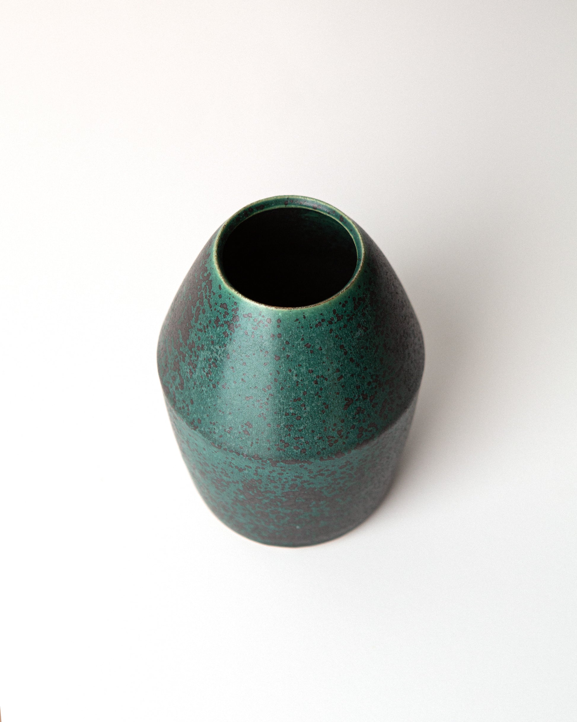 This angular vase was made with a gray/white stoneware clay body that's been covered in a glaze that goes from green to black, depending on the thickness of the glaze. It has been reduction fired to cone ten, (2350ºF).