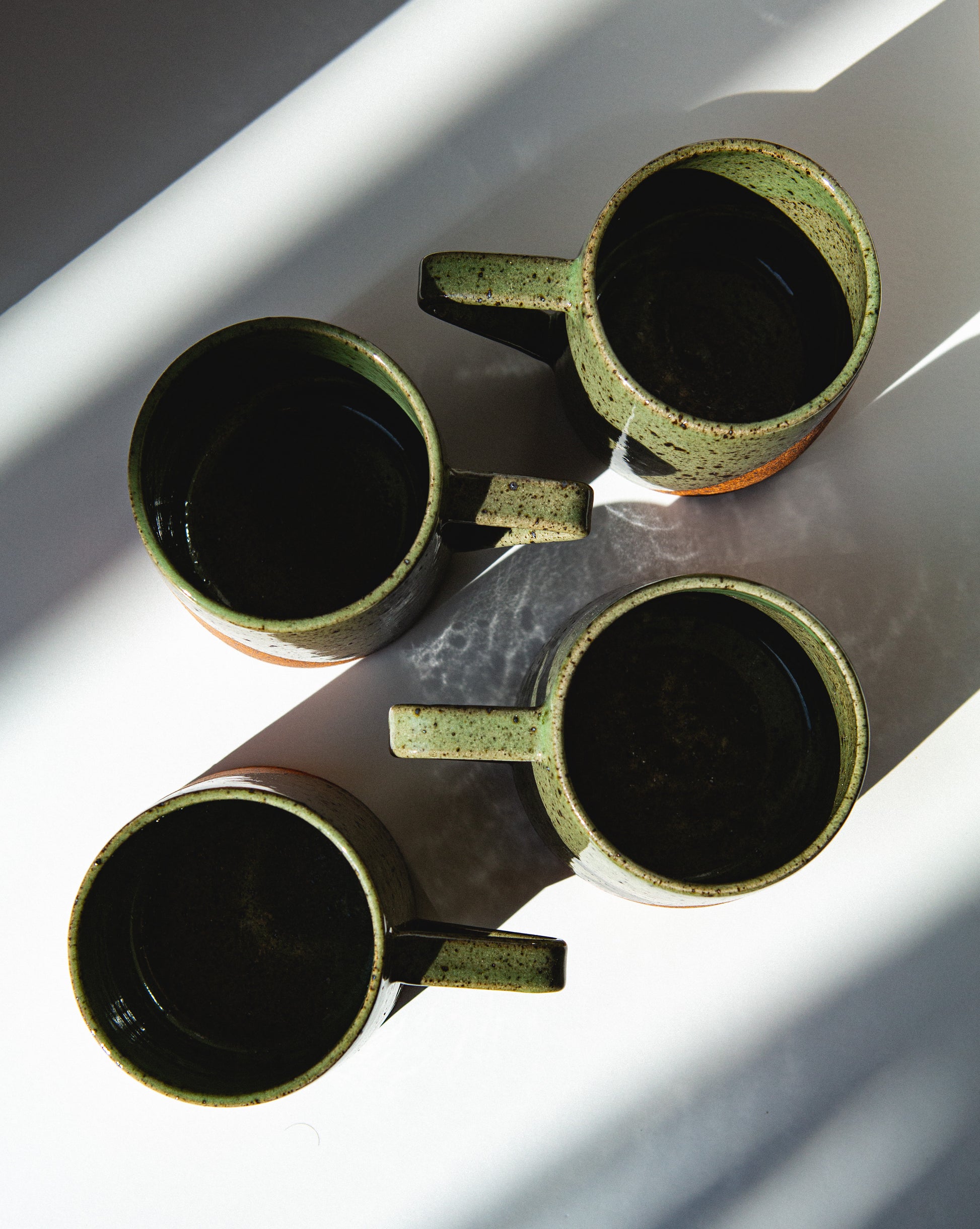 This angular mug was made with a reddish brown claybody that contains a lot of iron, giving it a unique speckled finish when fired to cone ten (2350ºF). It has been partially glazed in a dark green glossy finish. Holds approx 16oz liquid.